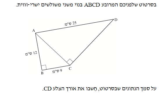במשולש ישר זווית - ניצב 1 בריבוע + ניצב 2 בריבוע = יתר בריבוע.