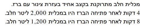 כתבו מהו הייצוג האלגברי של הפונקציה המתאימה לזמן שעבר מאז פתיחת הברז את נפח החלב במכלית