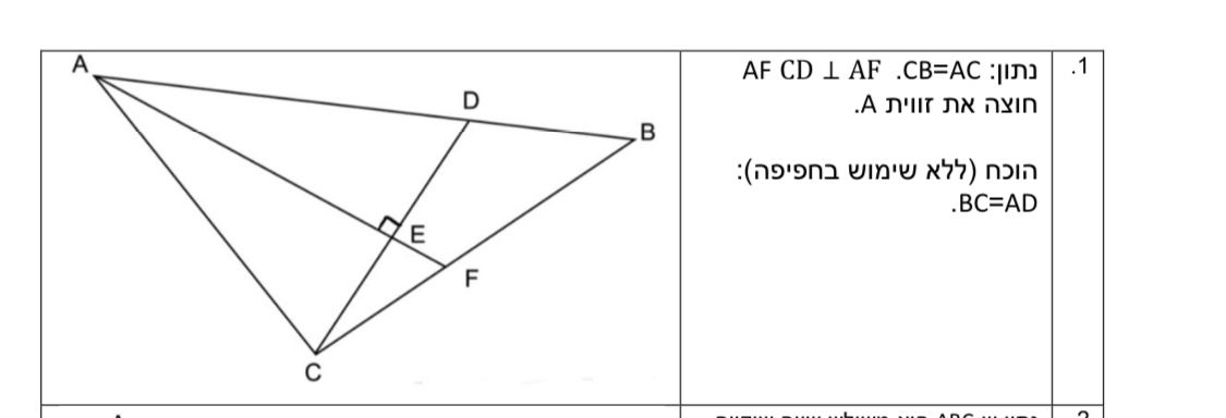 בעיקרון במשולש שווה שוקיים התיכון חוצה זווית והגובה מתלכדים כלומר הם אותו קו ואפשר לראות לפי הנתונים שבמשולש adc החוצה זווית והגובה מתלכדים אז אפשר להגיד שהוא משולש שווה שוקיים ואז ad שווה לac ובגלל שac שווה לcb אז גם cb שווה לad