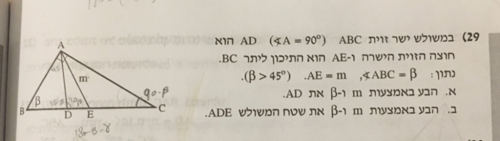 אחרי זה תעשה משפט הקוסינוסים על משולש abe ותבטא את ab בעזרת m ו- beta. ואז תעשה משפט הסינוסים על משולש abd ותוכל לחלץ את ad. יכול להיות שתצטרך לשחק קצת עם זהויות כדי לקבל את התשובה כמו שהם כתבו אותה (לא הראית את התשובה).