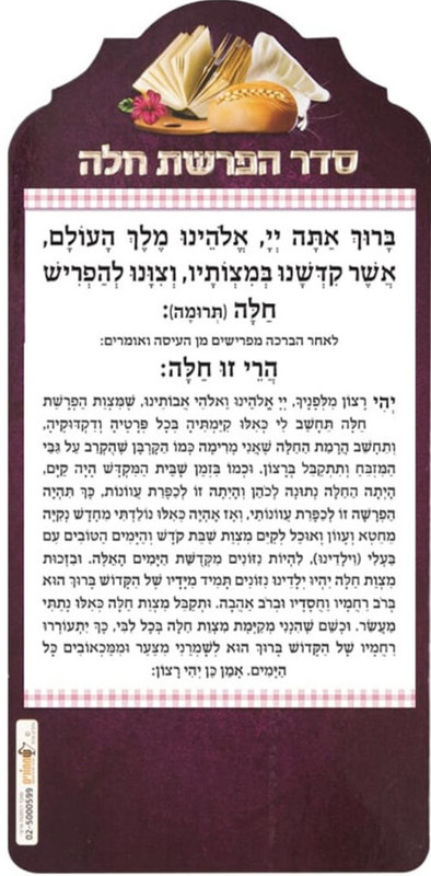 בָּרוּךְ אַתָּה יְיָ אֱלֹהֵינוּ מֶלֶךְ הָעוֹלָם אֲשֶׁר קִדְּשָׁנוּ בְּמִצְווֹתָיו וְצִוָּנוּ לְהַפְרִישׁ חַלָּה תְרוּמָה.